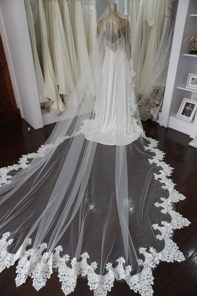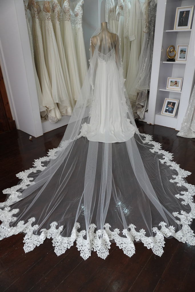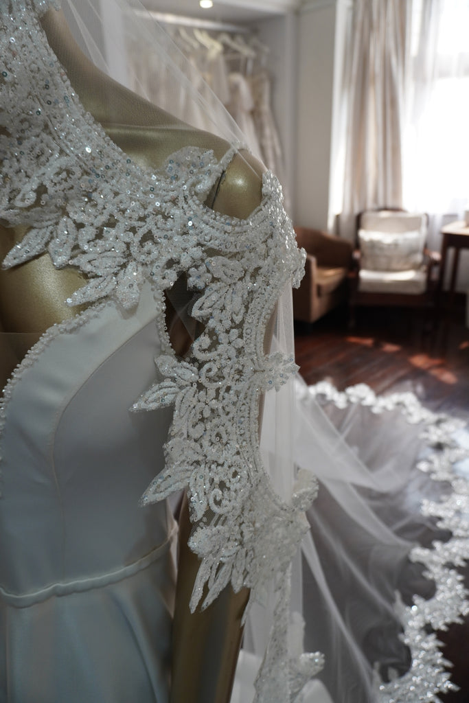 The Crystal Bloom Veil – A cathedral-length veil lavishly embroidered with shimmering lace, sequins, and beadwork. The ornate edging sparkles with every movement, framing the bride in radiant detail. A statement piece for the bride who dreams of glamour, elegance, and breathtaking sparkle from every angle.