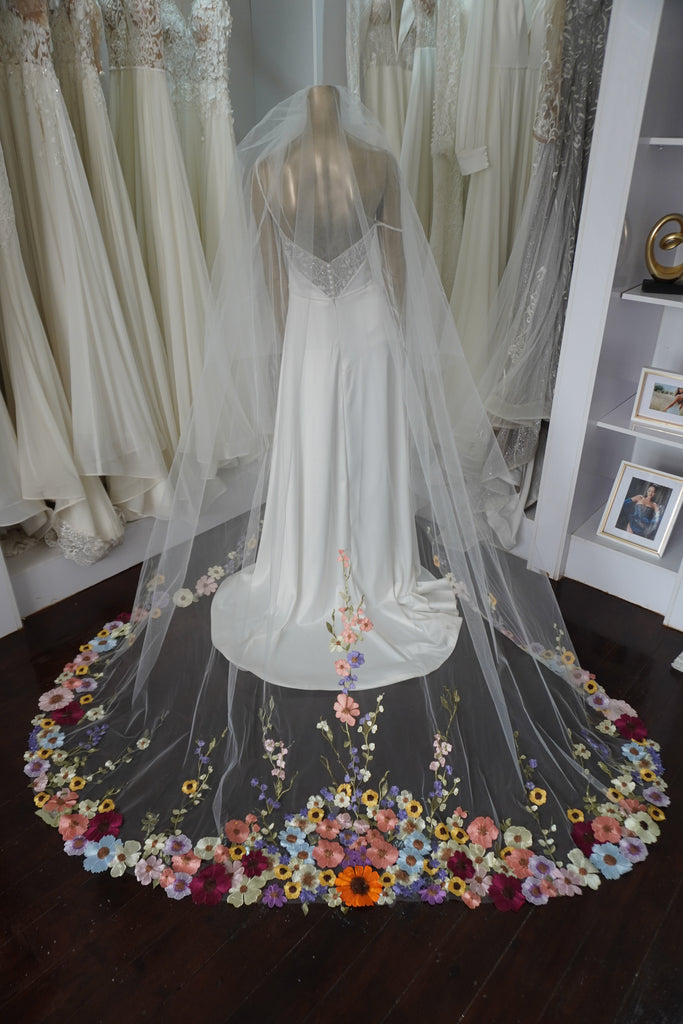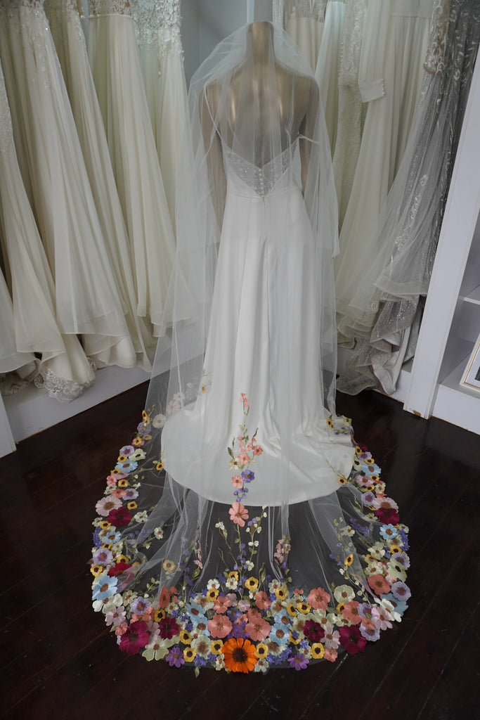 The Wildflower Veil – A cathedral-length veil bursting with colourful embroidered florals along the hem, like a meadow in full bloom. Playful yet romantic, it brings a touch of whimsy and artistry, perfect for brides who want to celebrate love with bold beauty and colour.