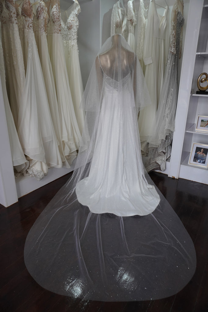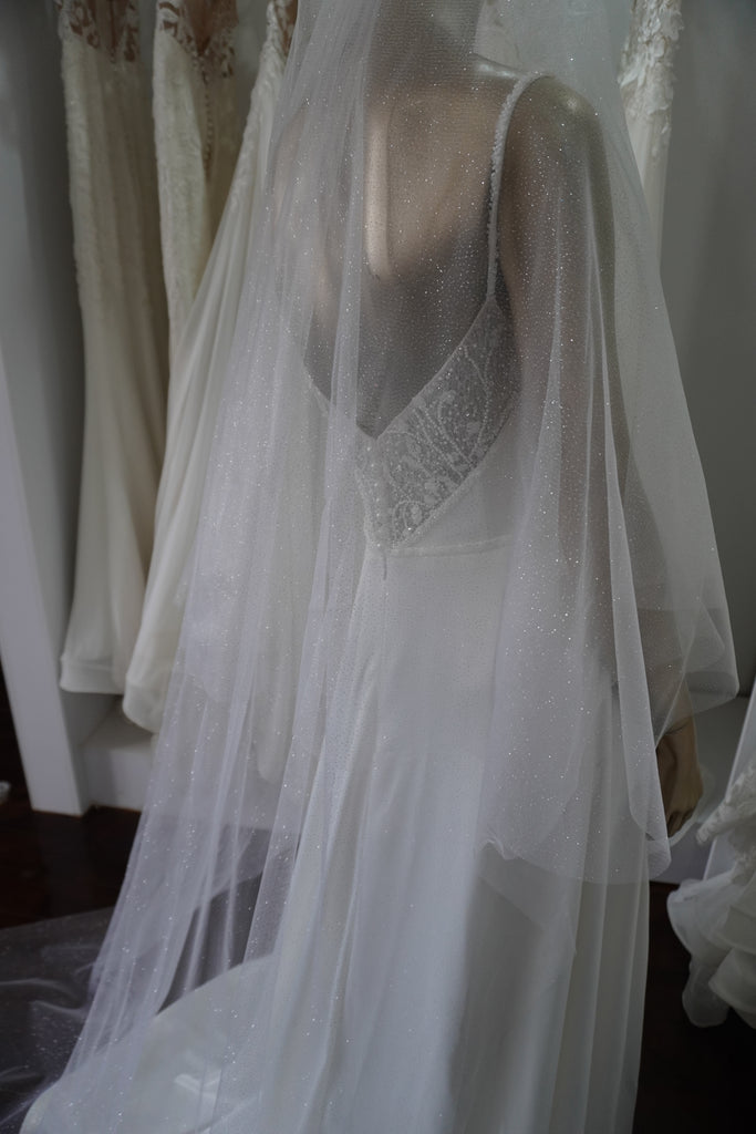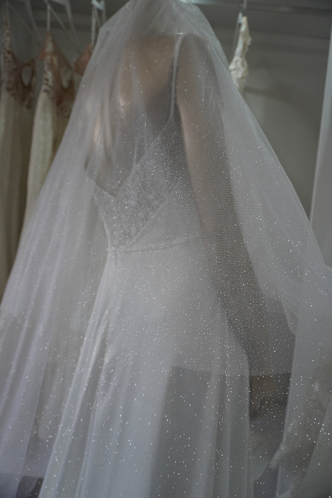 The Starlight Veil – A soft cathedral-length veil dusted with fine glitter that catches the light like a sky full of stars. Its sheer sparkle adds a dreamy, celestial touch, perfect for brides who want to shine with subtle radiance from every angle. A modern yet timeless veil that turns every step into a moment of magic.