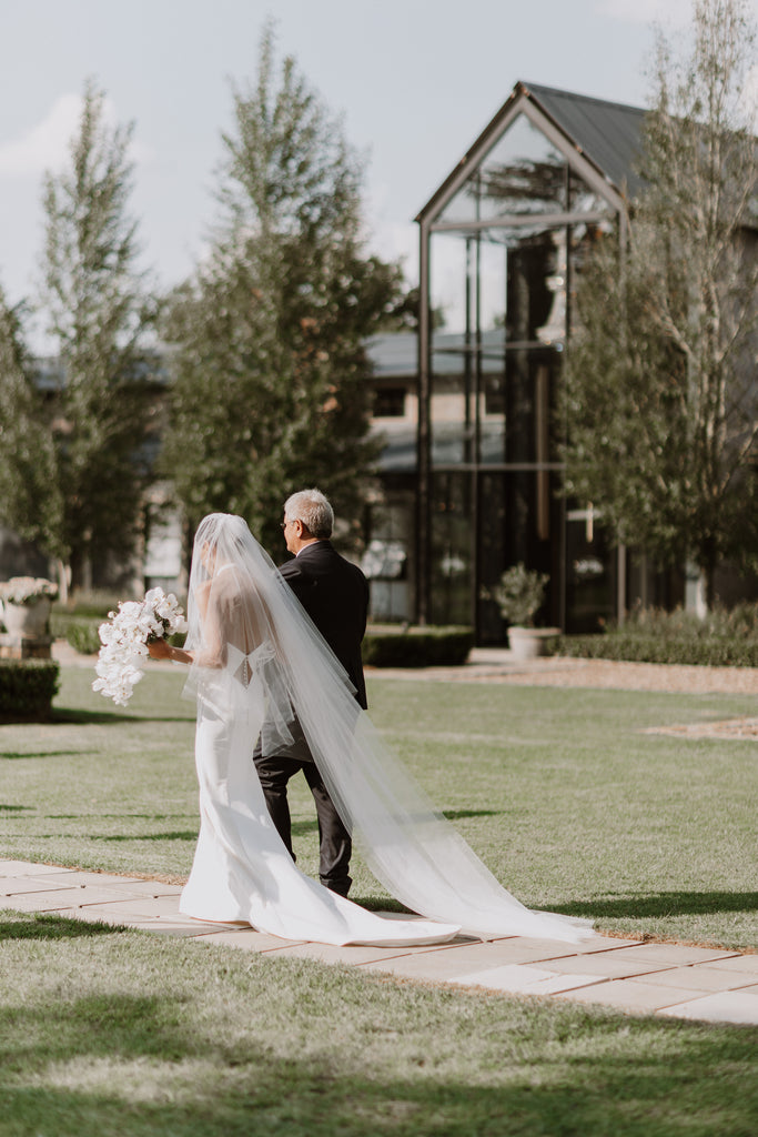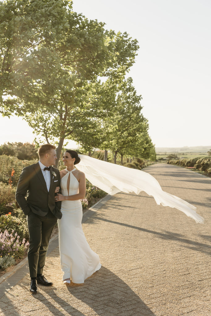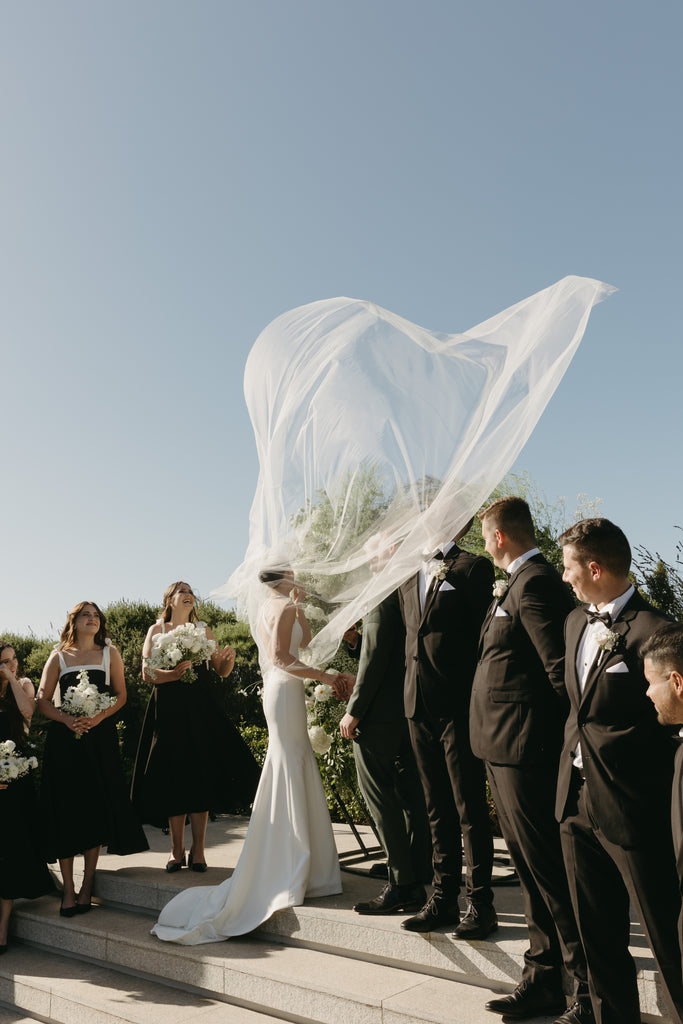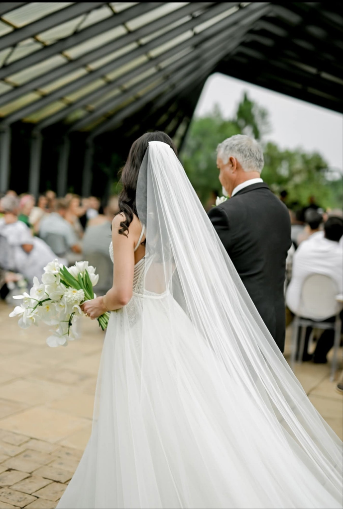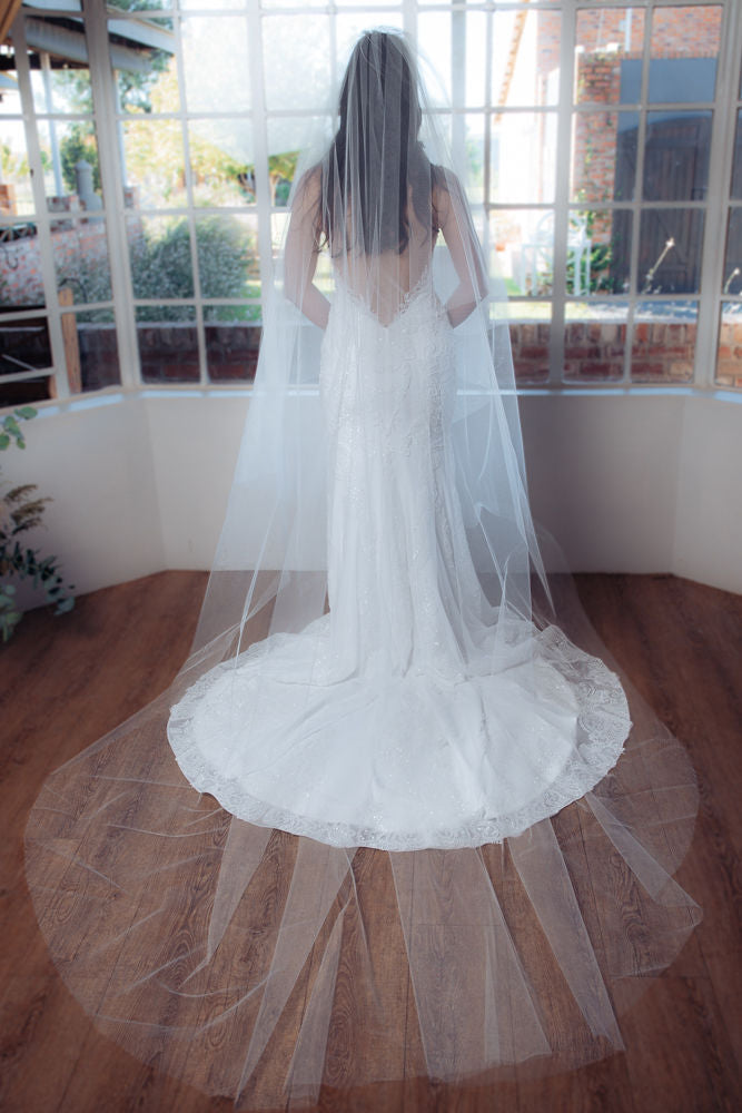 The Classic Grace Veil – A timeless chapel-length veil edged with delicate lace. Its light, flowing layers create a soft silhouette, adding just the right touch of elegance without overpowering the gown. A graceful choice for the bride who dreams of understated romance.