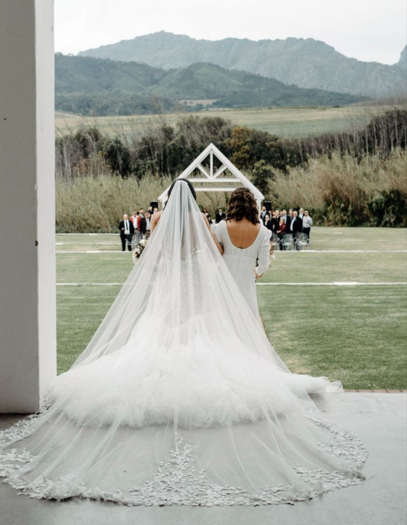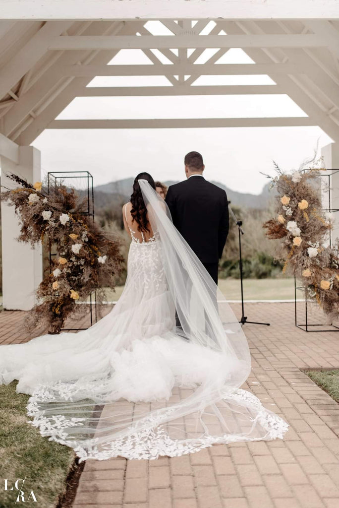 The Willow Veil – A chapel-length veil embroidered with soft trailing vines and leaves, creating a natural, graceful frame around the gown. Its airy design feels light and romantic, perfect for brides who love a touch of organic elegance woven into their bridal look.