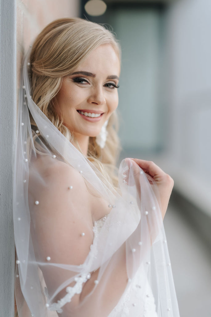 The Petite Pearl Veil – A delicate tulle veil adorned with scattered petite pearls, creating a soft, romantic shimmer. Its light placement of pearls adds just the right amount of texture and charm, making it an elegant choice for brides seeking timeless detail with a modern touch.