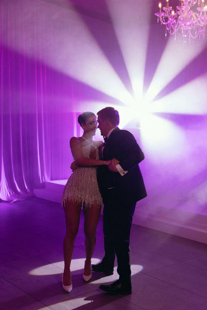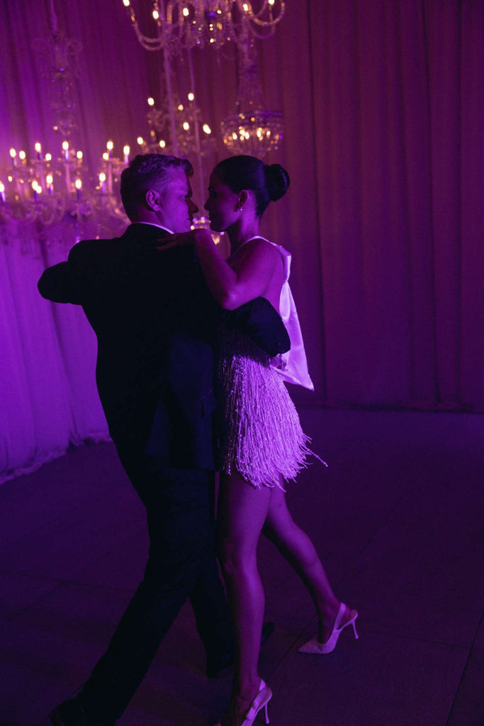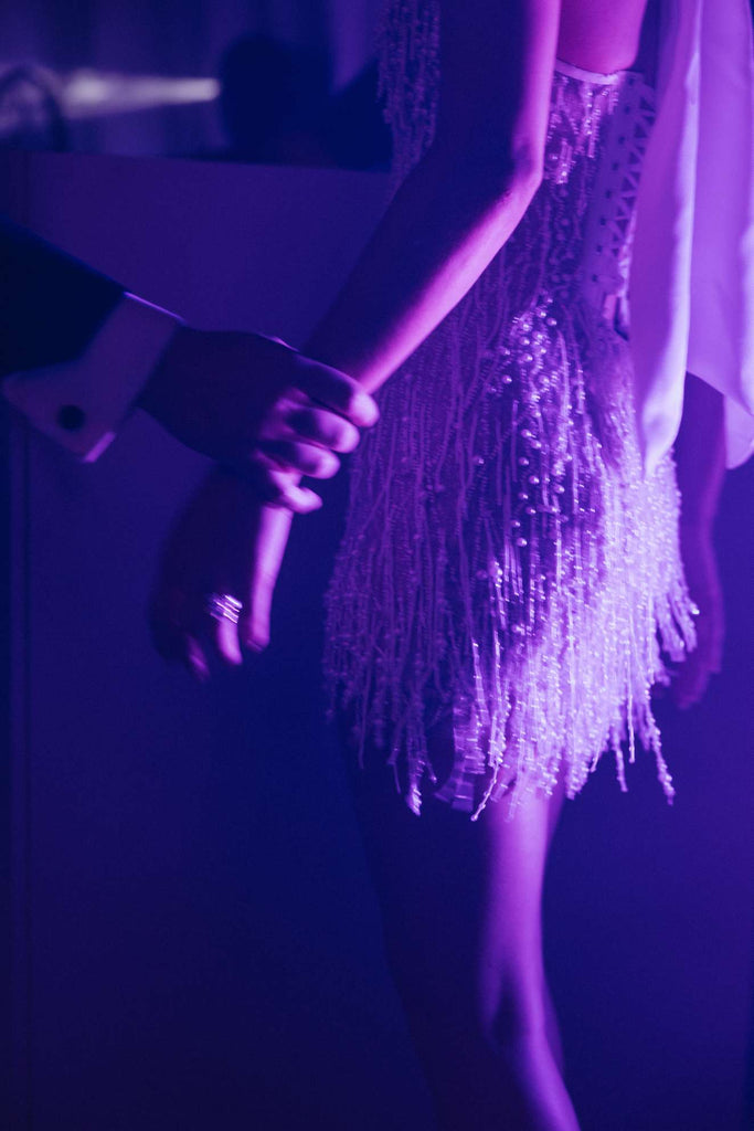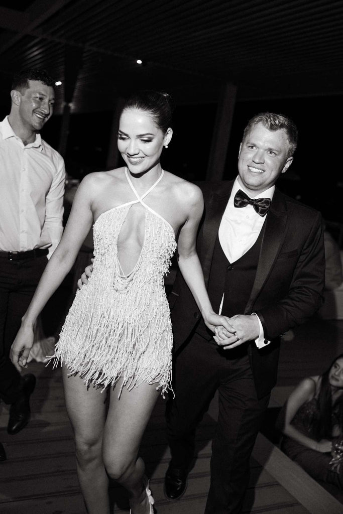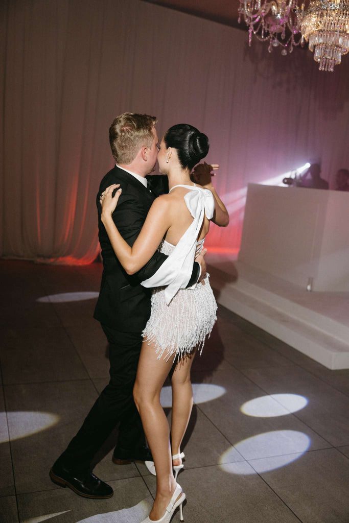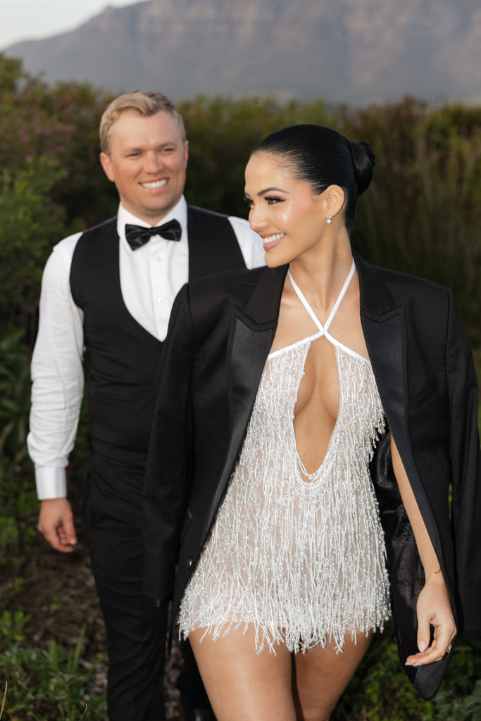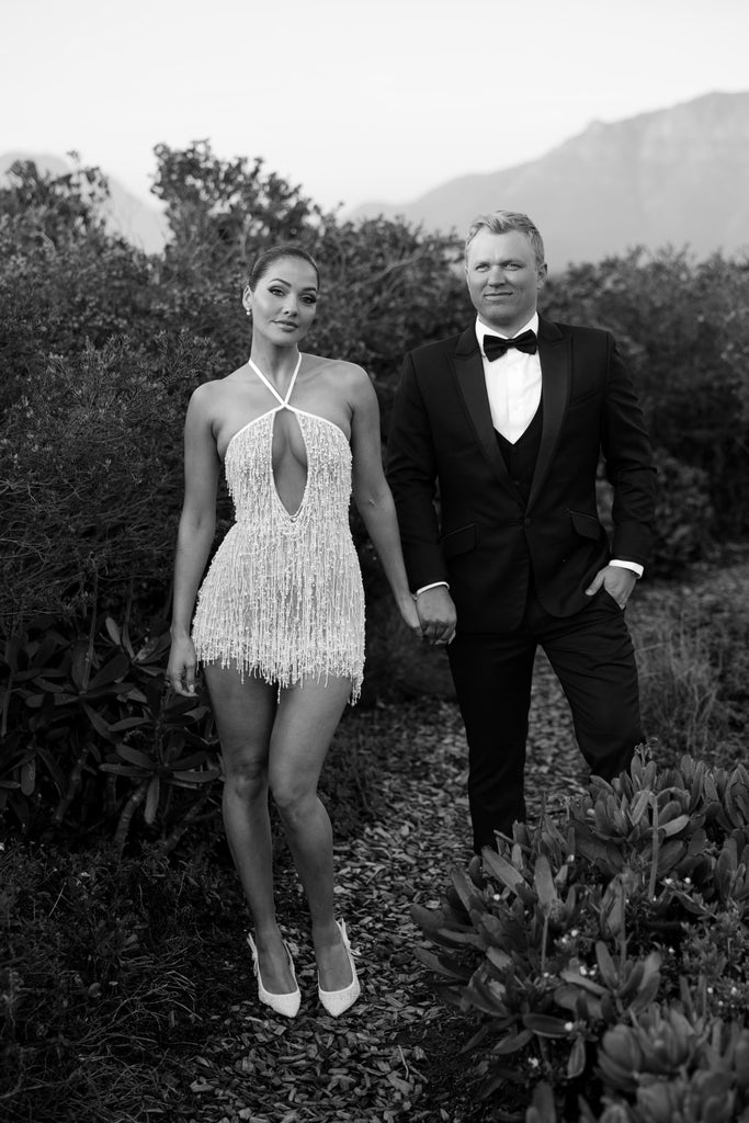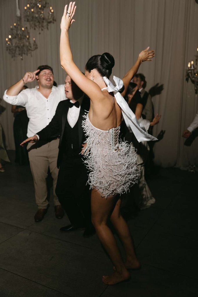 The sleek, floor-length satin skirt glides effortlessly with every step — smooth, luminous and sophisticated. Dramatic feathered sleeves and cascading feather detailing introduce couture texture and fluid movement, transforming the silhouette into something truly show-stopping.